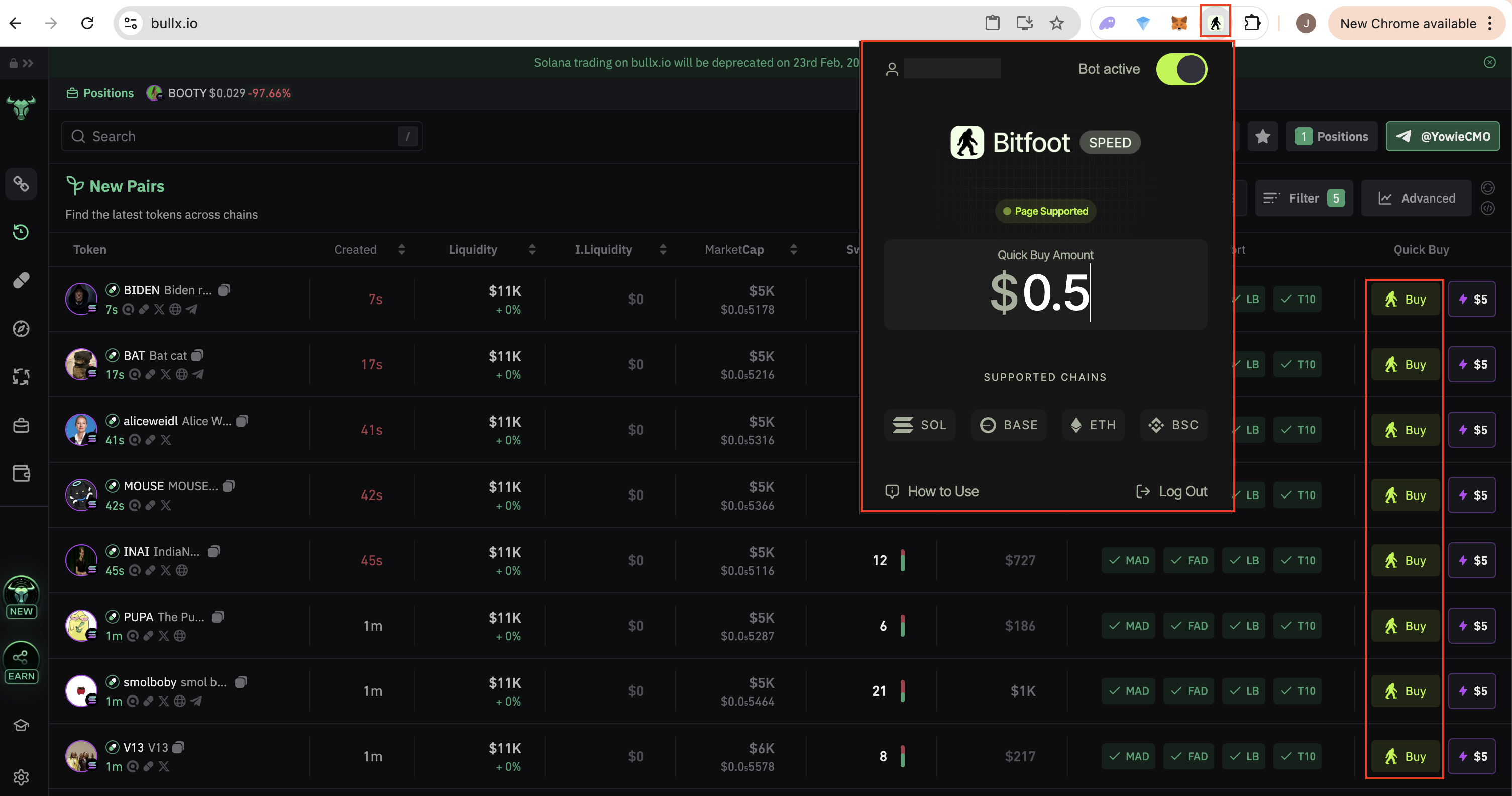 The [Bitfoot Speed Extension](https://chromewebstore.google.com/detail/imocfpmaclmhpkdhccieagipgbjjmjln?utm_source=item-share-cb) overlays a clean and powerful trading interface directly onto [crypto sites](https://docs.bitfoot.com/bitfoot-speed-extension/supported-platforms), allowing you to ape into memecoins instantly. No more tab-switching or copy-pasting contract addresses.